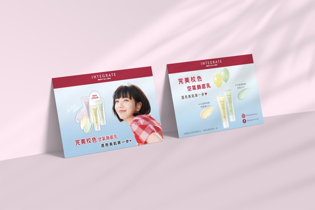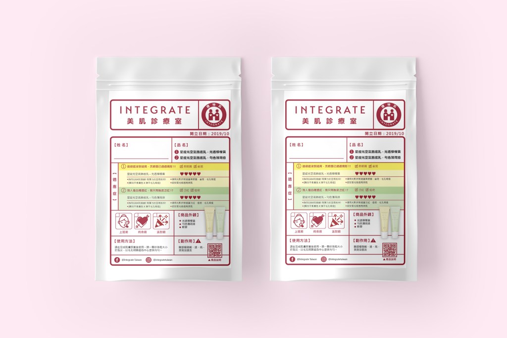 打造大人女孩的迷人臉龐,就從實現透明感美肌做起! INTEGRATE 美肌診療室的設計,以藥袋視覺概念為核心,展現產品專業且妝效好的形象。整體氛圍溫暖且專業,營造出產品能完美遮蓋肌膚瑕疵的訴求。