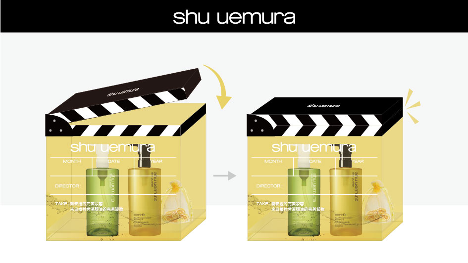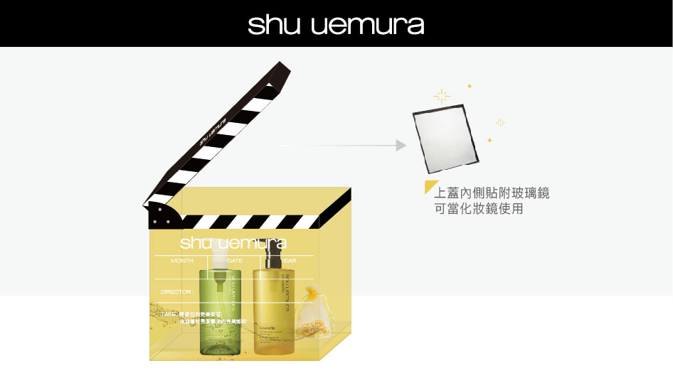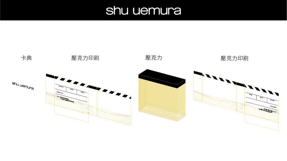 shu uemura 植村秀 最專業亞洲彩妝品牌。只要有心,走到哪都是你的時尚伸展台!故發想出場記板的idea。